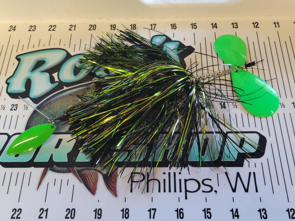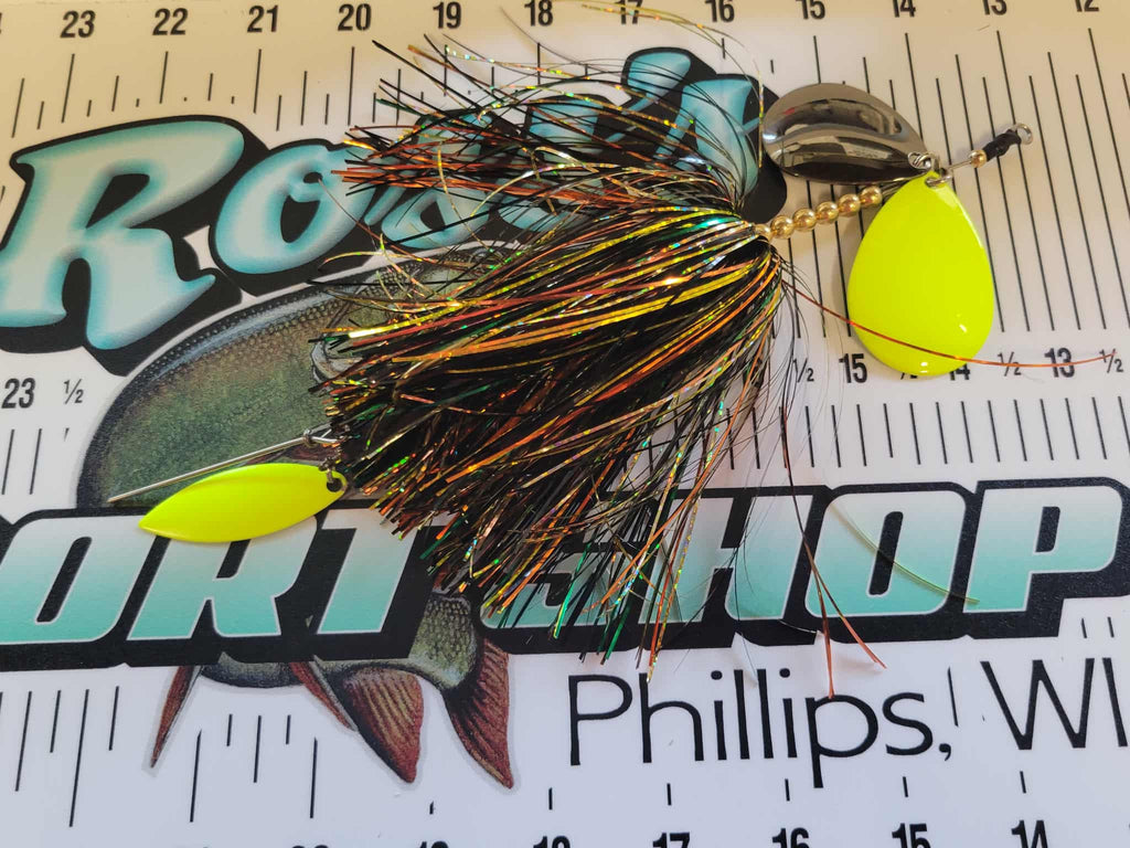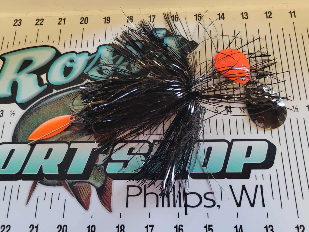 These awesome Bucktails are the talk of the Musky World, they feature an 8 and 9 blade like a normal stagger style bucktail but they add a willow blade trailer to the back hook and a special pin that "Bangs" off the trailer blade to add extra noise.